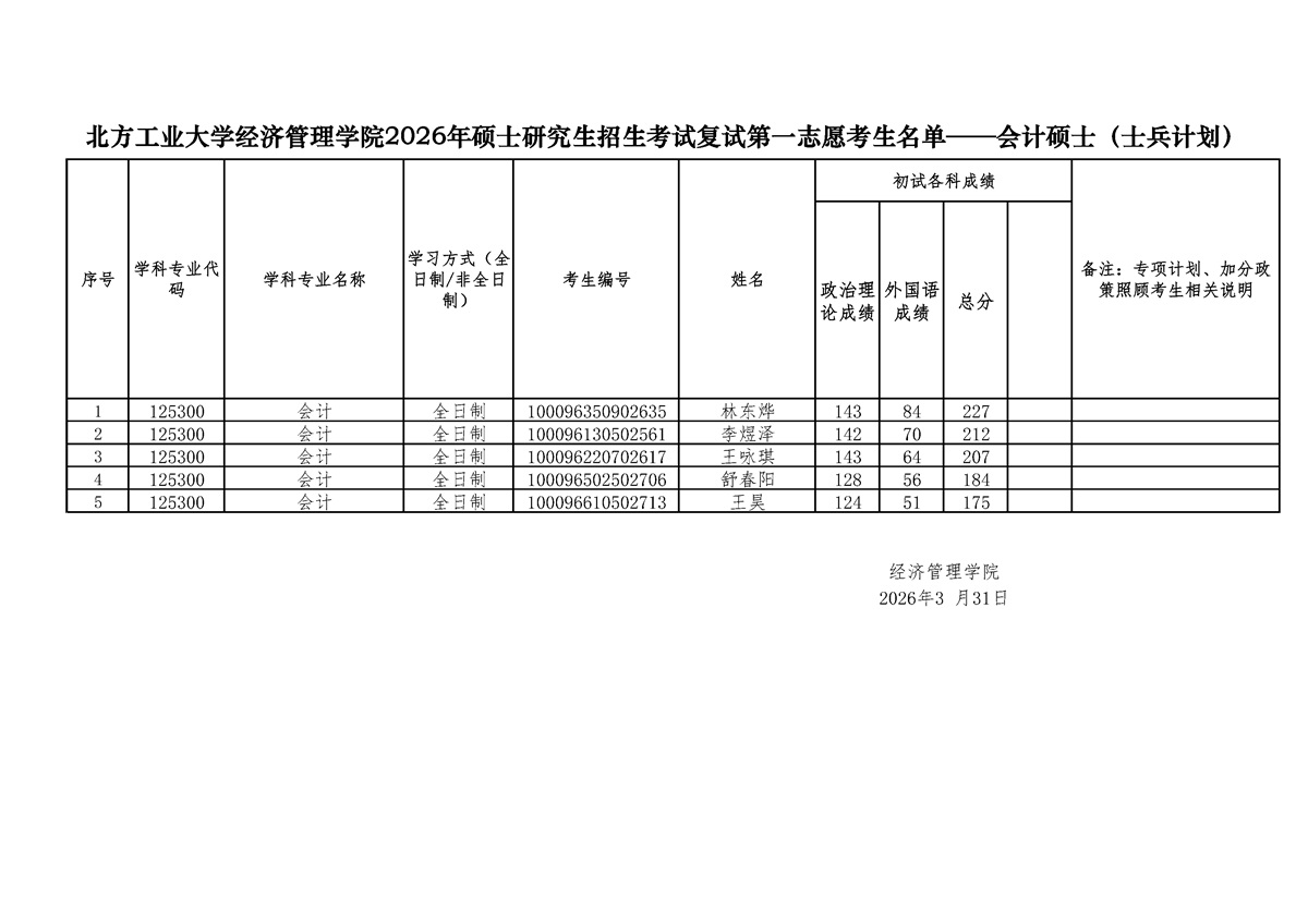 2138CC太阳集团2026年硕士研究生招生考试复试第一志愿考生名单——会计硕士(士兵计划)